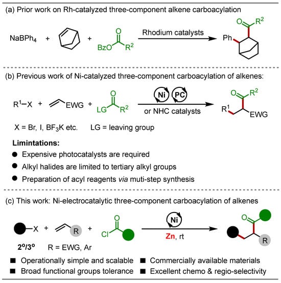 Ketones find widespread applications in pharmaceuticals, pesticides, and natural products [1,2,3,4]. Additionally, carbonyl compounds, a crucial class of organic synthesis intermediates, can undergo various transformations, including Wittig and reductive amination reactions [5,6,7]. Over the past few decades, the traditional industrial methods for the preparation of ketones have mainly involved catalytic oxidation in the presence of oxygen. However, these methods depend heavily on costly metal catalysts, stoichiometric oxidants, and high temperatures, which lead to poor functional group compatibility, substantial costs, and safety concerns, especially in large-scale production. Consequently, the development of efficient methods for synthesizing carbonyl compounds has become a critical area of research. In 2002, Miura and co-workers described a Rh-catalyzed coupling of sodium tetraphenylborate with acid anhydrides, both with and without norbornene, yielding aryl or alkyl ketones with moderate to good yields (Scheme 1a) [8]. This pioneering work demonstrated that transition-metal-catalyzed 1,2-dicarbofunctionalization via one-pot reactions is an effective method for rapidly synthesizing complex ketones by continuously introducing two functional groups into alkenes. Inspired by this work, various other transition-metal-catalyzed three-component carbonylation reactions have been documented [9,10,11,12,13,14,15,16,17,18]. Given this context and the demands of industrial production, it is imperative to develop simpler, more sustainable, and practical methods for alkene carboacylation.