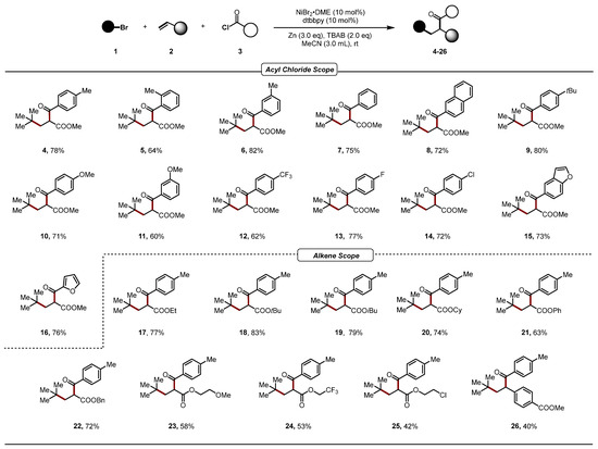 The mixture of 1 (1.0 mmol), 2 (0.2 mmol), 3 (0.6 mmol), NiBr2•DME (10 mol%), dtbbpy (10 mol%), TBAB (2.0 equiv.), and Zn (2.0 equiv.) was protected with N2 in anhydrous MeCN (3 mL). Then, the mixture was stirred at room temperature for 12 h. Removal of the solvent under reduced pressure afforded a residue that was purified by chromatography on silica gel to afford the products 4–43. The general experimental details and NMR spectra of the compounds can be found in the Supplementary Materials.