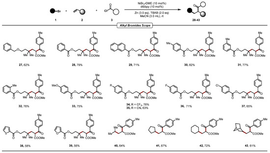 Subsequently, the substrate scope with substituted alkyl bromides was explored (Scheme 3). Tertiary alkyl bromides, featuring groups like methyl, methoxy, benzyl, halogen, trifluoromethyl, cyano, thiophene, and furan, were feasible and generated products 27–39 in good yields with excellent site selectivity. Additionally, secondary alkyl bromides, such as 2-bromopropanes, cyclopentyl bromide, cyclohexyl bromides, and 2-bromobicyclo [2.2.1]heptane, were likewise amenable (40–43).