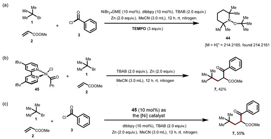 To gain mechanistic insights into this addition reaction, we conducted a series of experimental studies. Adding 3.0 equivalents of TEMPO significantly inhibited these transformations and prevented the detection of the corresponding products. Consequently, we detected the TEMPO-trapped species 44 using HR-MS (Scheme 4a). Moreover, we did not observe the corresponding product when using the pre-isolated Ni(II) complex 45 as a substrate in reactions with tert-butyl bromides 1a and methylacrylate 2a (Scheme 4b). This finding suggests that oxidative addition occurs subsequent to the alkyl capture by the nickel (II) complex 45. However, when the reaction was conducted using 10 mol% of 45 as a catalyst, we achieved a 55% yield of the additional product 7 (Scheme 4c).