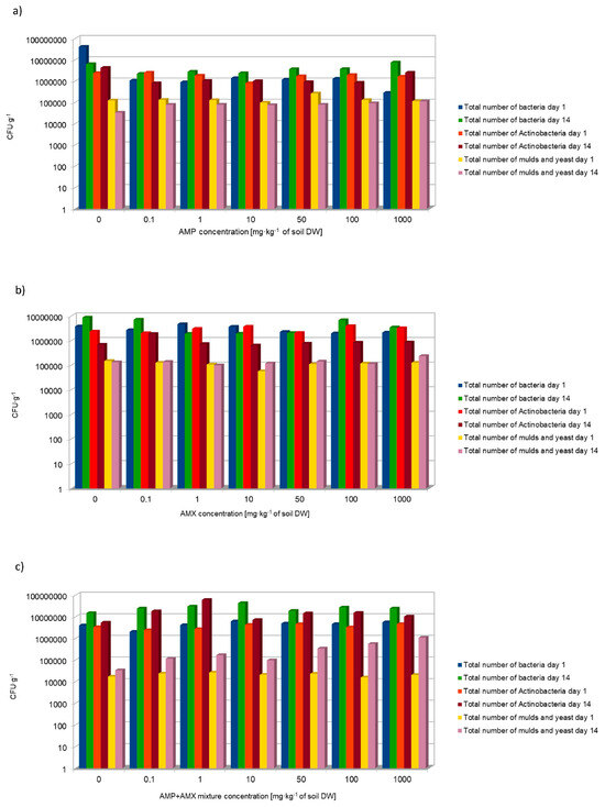 | Concentration of Antibiotics [mg·kg−1 of Soil DW] | AMP | AMX | AMP + AMX | ||||||