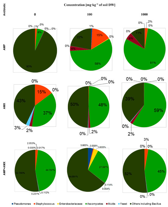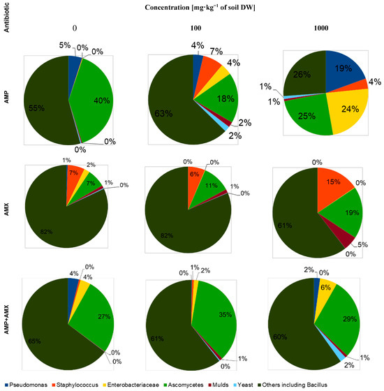 | Concentration of Antibiotics (mg‧kg−1 of soil DW) | AMP | AMX | AMP + AMX |