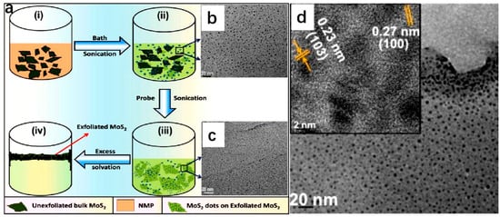 Mechanical force-assisted liquid phase stripping. The mechanical force-assisted liquid phase stripping method involves the application of mechanical forces (such as acoustic waves and shear) in a liquid to disrupt the van der Waals forces between layers, resulting in the production of 2D nanosheets. Mechanical force-assisted liquid phase stripping can be divided into acoustic wave-assisted liquid phase stripping and shear force-assisted liquid phase stripping. The acoustic-assisted liquid-phase exfoliation method involves dispersing bulk materials into a solvent for acoustic degradation. A large number of cavitation bubbles are distributed around graphite, and when the bubbles rupture, shock waves and microjets are generated. When the shock waves are transmitted to the free interface of graphite, tensile stress waves are reflected, and countless cavitation bubbles rupture, generating strong tensile stress around graphite for exfoliation (Figure 1a) [61]. Shaijumon et al. synthesized MoS2 quantum dots with a size of 2 nm using ultrasound-assisted liquid-phase exfoliation in 2014 (Figure 1b,c), resulting in a higher concentration of MoS2 active edge sites and stronger HER activity [61]. The method is simple and cost-effective, but the peeling efficiency is low, the size of the nanosheets is small, and impurities are easily introduced. In addition to being able to exfoliate graphene, this method has also been applied to prepare various 2D materials such as TMDs (MoS2, WS2, MoSe2, MoTe2, TaSe2, NbSe2, NiTe2, and Bi2Te3), h-BN, and TMOs (MoO3, WO3, etc.). Different from the above method, the shear-assisted liquid-phase exfoliation method utilizes the shear force generated by the rotor stator stirrer for exfoliation. Coleman et al. first proposed using a rotor stator stirrer to exfoliate graphene from graphite in 2014 and later used this method to exfoliate h-BN, MoS2, and WS2 [62]. The shear-assisted liquid-phase exfoliation method has high exfoliation efficiency and is a promising exfoliation technique. Currently, this method has been widely used in the commercial production of graphene.