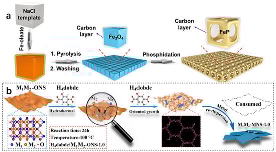 (a) Schematic showing the synthesis of 2D FeP nanoframe superlattices [73]. Copyright 2022, Wiley-VCH. (b) Schematic diagram of the 2D oxide sacrifice approach transformation process of M-MnS formed by metal oxide nanosheets and H4dobdc ligands, H4dobdc refers to 2, 5-dihydroxyterephthalac acid [74]. Copyright 2019, Wiley-VCH.