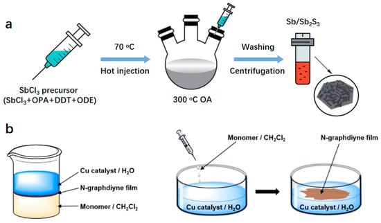 (a) Sb/Sb2S3 sample preparation process sketch [75]. Copyright 2023, Springer Nature. (b) Diagram of sample preparation at the liquid/liquid and gas/liquid interfaces [76]. Copyright 2018, American Chemical Society.