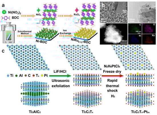 (a) Schematic illustration for the preparation of NiRu0.13-BDC catalyst [83]. (b) SEM images of NiRu0.13-BDC, HAADF-STEM images, and corresponding STEM-EDS mapping of NiRu0.13-BDC [83]. Copyright 2021, Springer Nature. (c) Schematic diagram of building Pt-SA on a Ti3C2Tx monolayer [84]. Copyright 2022, American Chemical Society.