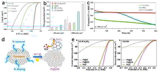 (a) LSV curves of Co-C3N4/rGO, Co-C3N4, C3N4/rGO, and Pt/C in 1.0 m KOH at a scan rate of 5 mV s−1 [106]. (b) Comparison of the overpotential required to reach a current density of 10 (500) mA cm−2 [106]. (c) Time-dependent overpotential curve of Co-C3N4/rGO, Co-C3N4, and Pt/C obtained at a constant cathodic current density of 100 mA cm−2 under 1.0 M KOH condition [106]. Copyright 2022, American Chemical Society. (d) A single vacancy trapping atom Pt is synthesized in a carbon matrix (defective graphene) to form the Pt-C3 configuration [107]. (e) Polarization curves of Pt@G, Pt@DG, and Pt/C with a scan rate of 10 mV s−1 [107]. Copyright 2022, American Chemical Society.