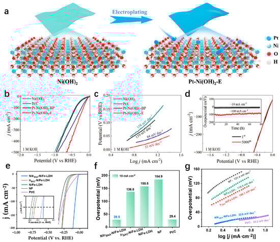 (a) Schematic illustration of the preparation for the Pt-Ni(OH)2-E [118]. (b) HER polarization curves of Ni(OH)2, Pt/C, Pt-Ni(OH)2-BP, and Pt-Ni(OH)2-E in 1.0 m KOH [118]. (c) Corresponding Tafel slope originated from LSV curves [118]. (d) Stability test of Pt-Ni(OH)2-E through potential cycling, before and after 5000 cycles in 1.0 m KOH. Inset: trigonometrical curves. HER performance of the as-prepared electrocatalysts and references in 1 M KOH [118]. Copyright 2023, Wiley-VCH. (e) LSV curves [120]. (f) Comparison of overpotential at 10 mA cm−2 [120]. (g) Tafel plots [120]. Copyright 2023, American Chemical Society.