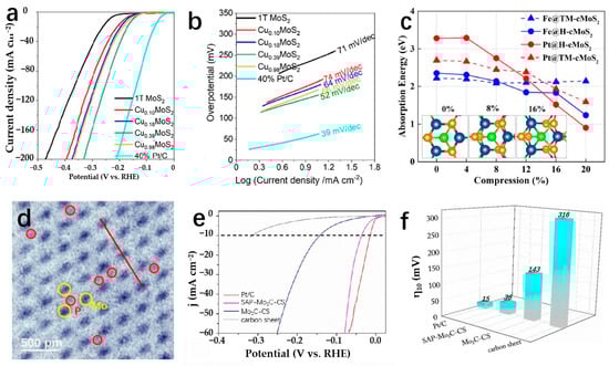 (a) HER LSV polarization curves of the as-prepared samples tested in 0.5 M H2SO4 solution [72]. (b) Corresponding Tafel slopes derived from HER LSV [72]. Copyright 2023, Wiley-VCH. (c) The adsorption energy of metal atoms on neutral cMoS2 as a function of compressions. The insets represent the top view of M@cMoS2 at different compressions [131]. Copyright 2021, Nanomaterials. (d) HAADF-STEM image of SAP-Mo2C-CS [132]. (e) HER polarization curves and corresponding η10 [132] (f), Tafel plots [132]. Copyright 2020, Wiley-VCH.