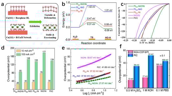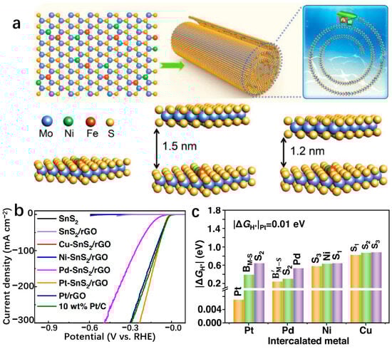 Two-dimensional materials are extensively studied as potential electrocatalysts due to their layered structures and unique electronic properties. Various materials can be converted into 2D layered structures, serving as supports for SAs to explore electronic interactions in depth. Moreover, tailored morphological characteristics can be integrated into 2D materials to enhance catalytic performance [155]. Chang et al. prepare the B/TM/B (TM = Co, Ni, Cu, Pd) intercalation structure, a novel 2D configuration where transition metal atoms are embedded in a bilayer boride (Figure 12a) [156]. This structure demonstrates energy stability, structural stability, and thermal stability, withstanding temperatures of at least 1300 K. Variants like B/Cux/B, B/Pdx/B, and B/Alx/B, with different metal coatings, exhibit very low HER free energies ranging from −0.162 to 0 eV. The electron energy levels in these systems are approximately 179 eV, −0.134 to 0.183 eV, and −0.082 to 0.086 eV, respectively, comparable to Pt. The B/TM/B system with a 2D intercalation structure displays good electrical conductivity, high structural and thermal stability, low intercalation resistance, a straightforward water decomposition process, excellent defect-dependent catalytic properties, cost-effectiveness in raw materials, and non-corrosive attributes.