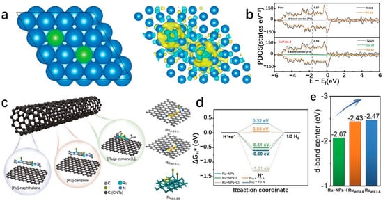 The hydrogen adsorption energy on a metal surface is primarily determined by the interaction between a hydrogen intermediate orbital and a metal d-orbital. The degree of filling of these orbitals affects the key performance index of hydrogen adsorption energy (ΔGH*). Predicting the performance of transition metal (TM)-based catalysts in the HER can be achieved by calculating the projected density of states (PDOS) of the d-band, which indicates the position of the d-band center (Figure 7h) [102]. The DFT method, known for computational efficiency and scalability in handling complex systems, is commonly used. However, it may not provide entirely accurate results for certain systems like strongly correlated systems or high-temperature and high-pressure conditions. The accuracy of DFT calculations also depends on the choice of generalized functions and basis sets. Despite its limitations, the DFT method is still reliable for predicting qualitative trends [103].