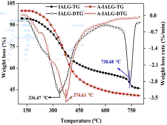 Thermogravimetric analysis (TGA) was utilized to investigate the pyrolysis behavior of IALG and A-IALG. As illustrated in Figure 1 (TG and DTG curves), the pyrolysis process of IALG primarily encompasses three stages: the dehydration stage (room temperature to 153.65 °C), the main pyrolysis stage of lignin (153.65 to 518.45 °C), and the carbonization stage (518.45 to 800 °C). The precursor of IALG, specifically the lignin in the biomass, possesses a high oxygen content (18–40 wt.%) and an abundance of oxygen-containing functional groups, which confer relatively good water retention properties onto IALG. As the pyrolysis temperature escalates, the free water within IALG evaporates, leading to a mass loss in IALG. With a continued increase in temperature, the lignin undergoes considerable decomposition. Nevertheless, due to the intricate chemical structure of lignin, which comprises both less thermally stable side chains and more thermally stable chemical bonds, the pyrolysis range of lignin is extensive, resulting in a broad and blunt peak on the DTG curve [21]. The most significant mass loss occurs during the primary pyrolysis stage of lignin (up to 35.33 wt.%), with the maximum weight loss rate and maximum constant rate occurring at −3.26 wt.%/min and 336.47 °C, respectively. Following the termination of lignin pyrolysis, the reaction proceeds to the carbonization stage. In this stage, the carbon structure derived from lignin undergoes further decomposition, and the pore structure progressively forms, resulting in relatively minor mass loss. Notably, a distinct narrow weight loss peak centered at 738.68 °C is observed for IALG during this stage, likely attributable to the decomposition of the minerals present in IALG. Comparatively, the TG and DTG curves of A-IALG exhibit a similar profile to that of IALG, with the exception of the weight loss stage near 738 °C. This observation further corroborates that the weight loss peak in IALG is due to the mineral content, which is largely removed in A-IALG post-acid treatment. Moreover, the initial pyrolysis temperature and the temperature corresponding to the maximum pyrolysis rate of A-IALG during the main pyrolysis stage are 163.53 °C and 374.63 °C, respectively, both of which are significantly higher than those of IALG. This indicates that the mineral content in IALG facilitates self-catalysis, lowering the pyrolysis temperature and promoting the decomposition of IALG. Similar findings can be found in previous studies [22,23].