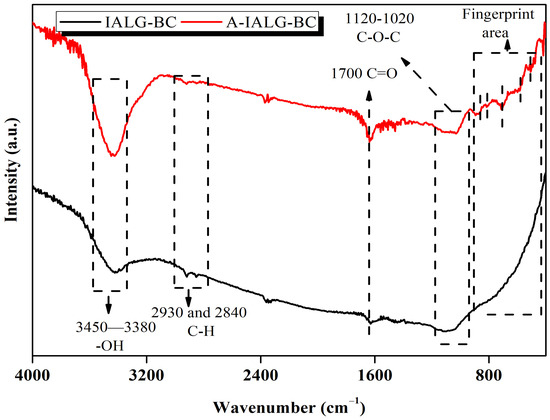 The FT-IR spectra of IALG-BC and A-IALG-BC, as illustrated in Figure 3, indicate a diverse array of surface functional groups. Notably, the absorption peak in the range of 3450–3380 cm−1 is attributed to the stretching vibrations of -OH groups [29]. The absorption peaks observed at 2930 and 2840 cm−1 correspond to the symmetric and asymmetric stretching vibrations of C-H bonds [29]. The peak at 1700 cm−1 is indicative of the stretching vibrations of C=O groups, while the absorption peaks located between 1120 and 1020 cm−1 are associated with the stretching vibrations of C-O-C groups [30,31]. In contrast, the FT-IR spectrum of A-IALG-BC reveals surface functional groups similar to those of IALG-BC, but with generally more intense peaks. This suggests that A-IALG-BC possesses a greater abundance of surface functional groups, particularly oxygen-containing functionalities such as -OH, C=O, and C-O-C groups. Consistent with prior findings, it can be inferred that the presence of minerals in IALG facilitates deoxygenation reactions during the pyrolysis process [32]. Additionally, the fingerprint region of A-IALG-BC exhibits numerous absorption peaks (860, 812, 705, 585, and 510 cm−1), primarily attributed to the stretching and bending vibrations of C-H bonds within the carbon skeletal structure and the vibrations of other single-bond surface functional groups [33,34]. These functional groups are notably absent in IALG-BC, indicating that the substantial mineral content in IALG not only aids in deoxygenation but also promotes further dehydrogenation in the resulting carbon material.