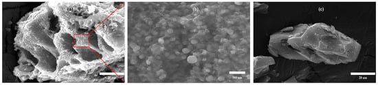 SEM images of biochars: (a) 5000× IALG-BC; (b) 150,000× IALG-BC; (c) 5000× A-IALG-BC.