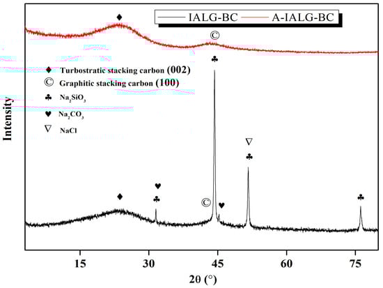 The crystalline phases of the minerals present in IALG-BC and A-IALG-BC were investigated using X-ray diffraction (XRD) analysis, with the results depicted in Figure 5. The XRD patterns reveal that IALG-BC contains a substantial amount of Na-related minerals, specifically Na2SiO3, Na2CO3, and NaCl, underscoring the significance of Na as a mineral constituent in IALG-BC [36]. Complementary to the SEM observations, it is apparent that these Na-related minerals predominantly exist as nanoparticles distributed on the surface of IALG-BC. Conversely, A-IALG-BC does not exhibit any prominent mineral diffraction peaks, which is consistent with the removal of ash during the acid treatment process. This observation aligns with the SEM findings presented in Figure 4. Moreover, the XRD pattern of A-IALG-BC displays two broad diffraction peaks around 23° and 45°, corresponding to the (002) reflection and the superposition of (100) reflections of the graphitic-type lattice, respectively [37].