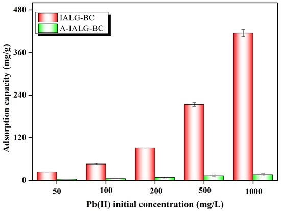 As illustrated in Figure 6, IALG-BC exhibits an exceptional adsorption performance for Pb(II), with the corresponding adsorption capacity progressively increasing with the initial concentration of Pb(II). For example, at an initial Pb(II) concentration of 50 mg/L, the adsorption capacity of IALG-BC is 24.11 mg/g. This capacity escalates to a maximum of 414.98 mg/g when the initial Pb(II) concentration is elevated to 1000 mg/L. This enhanced adsorption capability can be attributed to the abundance of active adsorption sites on the surface of IALG-BC. At higher concentrations of Pb(II), the increased mass transfer driving force improves the interaction between Pb(II) ions and the adsorbent, thereby promoting the adsorption reaction [38]. In contrast, while the initial Pb(II) concentration similarly influences A-IALG-BC, its adsorption capacities are markedly lower, ranging from 3.30 to 16.18 mg/g. This significant difference further underscores the role of Na-related minerals in IALG-BC, which act as highly efficient active adsorption sites for Pb(II), thereby substantially enhancing its adsorption capacity.