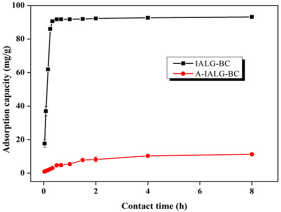 Effect of contact time on the adsorption capabilities of IALG-BC and A-IALG-BC.
