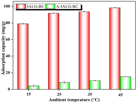 As depicted in Figure 8, the impacts of the ambient temperature on the adsorption of Pb(II) by both IALG-BC and A-IALG-BC exhibit a similar pattern, whereby an increase in temperature enhances the adsorption capacity of the respective biochars. For example, at an ambient temperature of 15 °C, the adsorption capacities of IALG-BC and A-IALG-BC for Pb(II) are 79.02 mg/g and 4.16 mg/g, respectively. When the temperature is elevated to 45 °C, the corresponding adsorption capacities rise to 98.27 mg/g and 15.17 mg/g, respectively. This phenomenon can be attributed to the increased thermal motion of adsorbates (such as Pb(II)) at higher temperatures, which enhances the likelihood of collisions between adsorbates and adsorption sites, particularly those that are less accessible at lower temperatures, thus facilitating the adsorption process [16]. Additionally, some adsorption reactions are endothermic and require an input of energy; thus, an increase in ambient temperature can supply the necessary energy to enhance the adsorption efficiency. It is well documented that the adsorption processes for pollutants by most biochars are endothermic and energy-consuming [16,17].