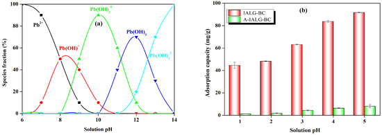 Forms of Pb(II) at different solution pH values (a) and effect of solution pH on the adsorption capabilities of IALG-BC and A-IALG-BC (b).