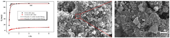 Adsorption kinetic fitting for the adsorption of Pb(II) on IALG-BC and A-IALG-BC (a), SEM image of 5000× IALG-BC after Pb(II) adsorption (b) and SEM image of 150,000× IALG-BC after Pb(II) adsorption (c).