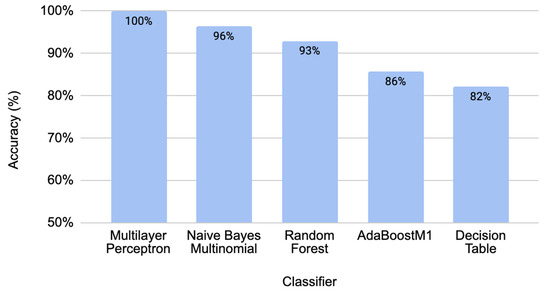 Accuracies of 10-fold cross-validation for several best classifiers with the developed ML model are shown in Figure 1. The best-performing models reached over 90% accuracy with the 10-fold cross-validation—ML algorithms such as the multilayer perceptron (MLP)—100%, Naïve Bayes Multinomial—96%, and Random Forest—93%, gave perfect values for all derivatives of the confusion matrix (Table 1). Accuracies for the best classifiers are illustrated in Figure 1. The ROC curves (Figure 2) demonstrate a very high performance of classifiers on the classification thresholds. Overall, the MLP shows the best results in cross-validation, but the Naïve Bayes Multinomial gives the most accurate results in the independent data testing (Figure 3). The entire dataset including all selected and random descriptors was used for cross-validation and resulted in Figure 1 and Figure 2.