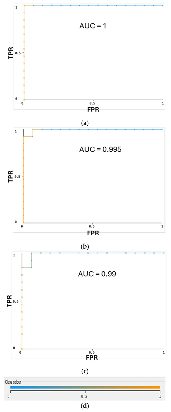 ROC curves for ML classifiers for the testing data set: (a) Multilayer Perception; (b) Naïve Bayes Multinomial; (c) Random Forest. (d) Color interpretation of ROC curves. Color represents threshold value set to get the best pair of true FPR/TPR point.