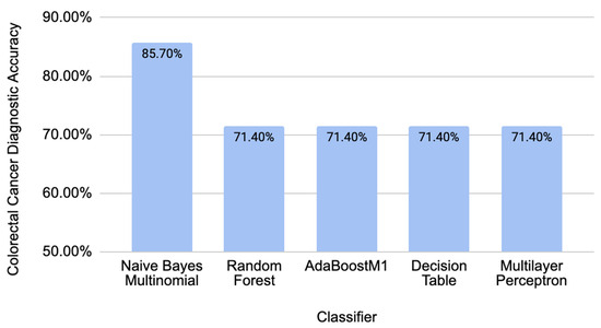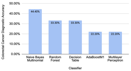 To test the validity of our model on an independent new dataset, we used data from piRBase with known associations with CRC. All the piRNAs in this dataset were not present in the piRNAs used for training a model [14]. Taking seven new piRNAs with correspondence to CRC (piR-000335, piR-005132, piR-015481, piR-021520, piR-015551, piR-020980, and piR-002587), we calculated all the corresponding sequence descriptors and tested them in the trained model. The resulting accuracies were calculated by taking the total number of predicted biomarkers over all the piRNAs tested in the independent dataset. Figure 3 summarizes the diagnostic accuracy for the new independent data of the best-performing classifiers used from previous data to train the model. These accuracies show that our model can make diagnostics with independent data related to CRC.