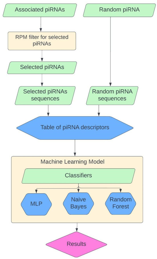 Flowchart of the Method. The list of piRNAs associated with a disease was collected from experimental studies, then it was filtered by the values of fold changes of RPM in relation to normal subjects. Also, the equivalent number of random piRNAs was selected. The sequences were extracted from both datasets and used for the creation of sequence descriptors. These descriptors were used for the development of an ML model using various classifiers. The ML model with the best accuracy was used for further exploration of new data.