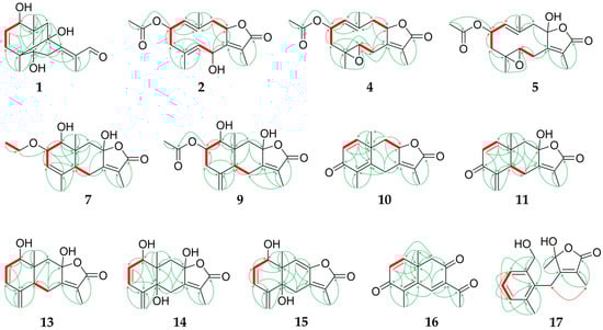 Key HMBC (green arrows) and COSY correlations (red, bold or red arrow) of sesquiterpenoid compounds with new constitution.