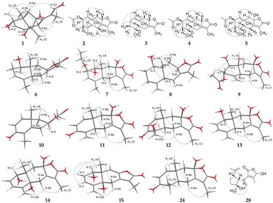 Key NOESY correlations (blue arrows, missing ones: red arrows) of chiral sesquiterpenoid compounds with new constitution or configuration. Three-dimensional structures were calculated using Chem3D where reasonable.