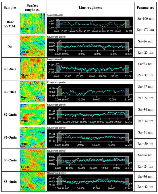 For the initial evaluation, laser microscope analyses were performed to examine the surface microroughness, line average roughness, and morphology of the treated SS316L. Chemical etching dissolves the high free energy regions of the SS3166L surface, creating deep and regular etch marks along the grain boundaries [17]. Consequently, the arithmetic mean roughness (Ra) and arithmetic mean height (Sa) values of the newly formed surfaces after etching were higher compared to the polished SS316L surface (Sp). Two different immersion times were applied for each solution to observe changes in surface roughness. Before applying any pretreatment, the surface of bare SS316L exhibits numerous irregularities, such as peaks, valleys, and other defects, leading to a non-homogeneous surface with an average roughness of 170 nm. Polishing is used to smooth out these irregularities, creating a more homogeneous and even surface, reducing the Ra to 23 nm. For etchant 1, the Ra increased from 23 to 74 nm, and it is obvious that the surface morphology changed and revealed grain boundaries. Increasing the immersion time increased the Ra, Sa and changed the morphology of the substrate. Different etching times were applied, and the samples’ morphology was checked each time using laser microscopy. However, only two etching times were presented to highlight the similar roughness for comparison of the etching solutions. Excessive roughness can lead to undesirable effects, such as creating stress concentration points or making the surface highly irregular for uniform coating [19]. Therefore, based on the results of each sample presented in Figure 1, the optimal immersion time for each etchant (S1−7 min, S2−3 min, and S3−4 min) was determined based on the surface average roughness for further investigation.