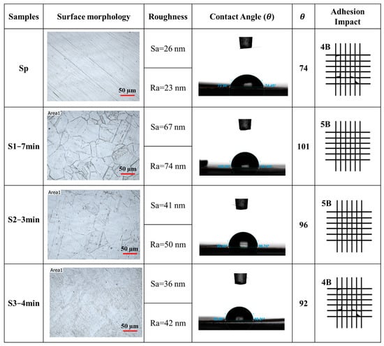 Comparison of surface morphology, mean surface roughness (Ra) and mean surface height (Sa), contact angle, and adhesion impact of the SS316L surfaces with different pretreatments.