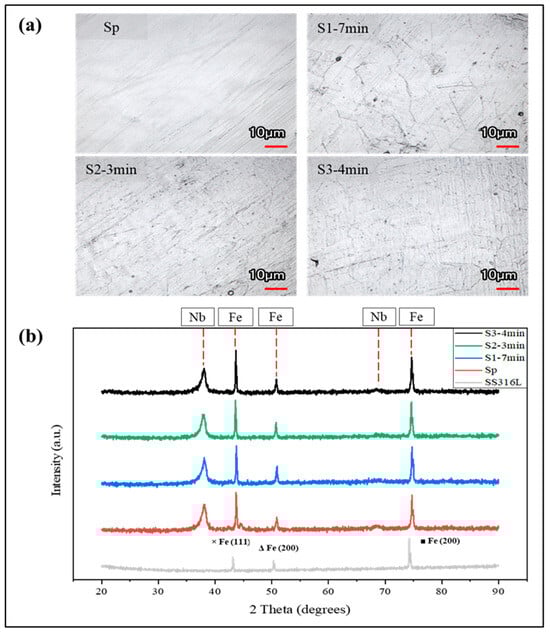 (a) Comparison of surface morphology for all coated samples. (b) X-ray diffractograms of uncoated and niobium (Nb)-coated SS316L samples.
