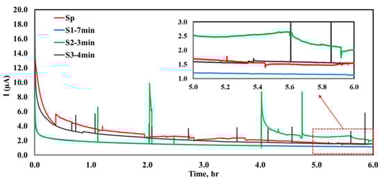 The potentiostatic polarization test was conducted at a potential of +0.8 V vs. RHE, simulating the anodic conditions of fuel cells. The potentiostatic curves (Figure 5) reveal that the Icorr for S1−7 min (1.1 μA.cm−2) is lower than that of the other samples (Sp (1.5 μA.cm−2), S2−3 min (2.1 μA.cm−2), S3−4 min (1.6 μA.cm−2)) after 6 h. This significant reduction in Icorr for S1−7 min, compared to the other samples, can be attributed to the effective surface coverage of the coating material on the SS316L BPP, which successfully prevents the acidic electrolyte from reaching and damaging the substrate. As shown in Figure 5, S1−7 min exhibits no fluctuation in current during the 6 h polarization, indicating rapid stabilization of the coating compared to the other samples. Hence, these fluctuations for other samples can be attributed to the instability of coating, localized corrosion processes on the surface, and surface reaction and passivation as the surface layer forms and changes due to the applied potential. Furthermore, the coated sample with S1−7 min pretreatment not only enhances the durability of the BPP but also ensures its improved corrosion resistance, contributing to the longevity of the catalyst layer and the overall PEMFC stack. If the BPP corrodes less, it causes fewer contaminants, which could potentially reduce the degradation of the catalytic layer in PEMFCs, thereby maintaining catalytic efficiency over time [40].