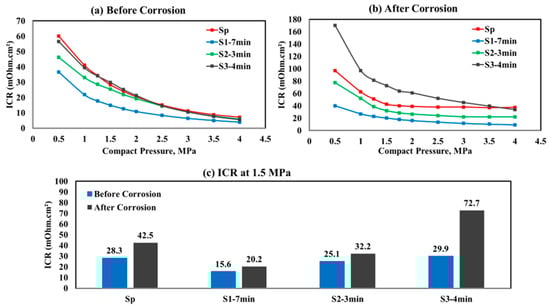The ICR measurement results at different compaction forces for all BPP samples, both before and after potentiostatic polarization, are presented in Figure 6a,b. Figure 6 shows that the ICR for the S1−7 min sample is slightly lower than that of the other samples under the initial conditions, both before and after polarization. Although the ICR remains above 10 mΩ.cm2 across the 150 MPa (Figure 6c), the behavior under varying pressures provides a sufficient comparison to evaluate the effect of the different pretreatments on BPP performance. After six hours of potentiostatic polarization, the S1−7 min sample shows a smaller increase in ICR compared to the other samples. This improvement indicates that the sample offers a robust barrier against corrosion, likely due to the strong adhesion of the coating to the substrate. This result highlights the role of pretreatment in enhancing the electrical conductivity and reliability of the sample, making it a superior choice for long-term applications where corrosion resistance is critical. Lower ICR can contribute to better electron transfer efficiency, which is crucial in catalytic processes within the fuel cell. This can indirectly enhance the performance of the catalytic reactions in the fuel cell [40].