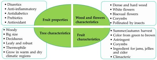 S. domestica is a valuable tree both for its practical uses and for its contribution to the environment. The main characteristics of this species are shown in Figure 1. Its cultivation and conservation can offer multiple benefits, from food products and durable materials to improving the biodiversity and ecological stability of the regions where it grows []. In some regions of Spain, it has been classified as a vulnerable species and is at risk of declining []. The fleshy S. domestica fruits with smooth skin differ in shape and size. Their color varies from greenish to reddish tones depending on their state of maturity []. The fruits of S. domestica L. are very astringent until they ripen due to rapid enzymatic fermentation, at which time they acquire a brown color and pleasant flavor. The fruits can be consumed in different forms such as jams or jellies []. There is also evidence that since Roman times, the fruits of S. domestica have been used to cure intestinal problems and as an additive for preserving apple cider []. They are also used in some areas to make distilled beverages [,]. In the community of Xanthi (Greece), the population uses this fruit, not only as food but also as a traditional astringent, antidiarrheal, and antidiabetic agent in the form of pulp [].