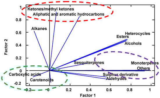 Factor analysis can help to establish the relationships between aromatic components (Figure 2). The group with low values of factor 1 and factor 2 (green line) is mainly characterized by its high content of carotenoid compounds and fatty acids; this group would include quince jam. The group with high values of factor 1 and low values of factor 2 (purple line) is mainly characterized by high concentrations of monoterpenes, sulfur-derived components, the major component 2,4,5-trimethyl-1,3-dioxolane (included in the group of others), and even by the strength of sesquiterpenes; this group includes pear-shaped S. domestica fruits. The third category, with high values of factor 2 and neutral values of factor 1 (red line), is represented by high values of aliphatic and aromatic hydrocarbons and ketones; this group includes apple-shaped S. domestica fruits.