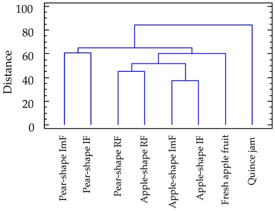 The cluster analysis carried out on all the volatile components detected in the study expanded the classification. The analysis created one cluster (Figure 3) where the quince jam samples stand out from the rest. In addition, the apple-shaped S. domestica samples bridged the gap with the aromatic components found in fresh apples and with the ripeness states of both types of S. domestica fruit. The samples with the greatest distance were those of S. domestica fruits in the unripe states.
