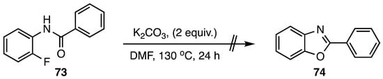 Our results are summarized in Table 1. As expected, the conversion proceeded in high yield for benzanilides and lower yields for acetanilides. The reaction required only base and heat to initiate the cyclization. No other additives or catalysts were required, and thus the removal of trace metals was not required in the product purification scheme. Despite the high temperature conditions the reaction was remarkably clean. In the case of benzanilides, no major side reactions were noted. Additionally, while the sensitivity of the acetanilide side chains to the basic conditions led to lower yields, no isolable side products were generated. Since the substrate loses only a proton and a fluoride ion (20 amu total), the transformation possesses high atom economy [27,28]. The required temperature for benzanilide cyclizations correlated with the potency of the activating group at C5 of the SNAr acceptor ring. Nitro was the most powerful activator, and reactions of benzanilides 8–14 were complete in 1 h at 90 °C. Cyano- and methoxycarbonyl-activated substrates, 18–24 and 25–31, respectively, showed intermediate reactivity requiring 1 h at 115 °C and 2 h at 120 °C. Finally, the trifluoromethyl group was the least potent activator, and precursors 32–38 incorporating this moiety required 3 h at 130 °C for complete conversion. Acetanilides 5–7 required 4–6 h at 90 °C while 15–17 needed 4–6 h at 115 °C, and reaction progress proved more difficult to monitor by thin layer chromatography (TLC). The extended heating of these substrates in the presence of K2CO3 at >115 °C led to decreased yields, and, as a result, acetanilide derivatives with CO2Me and CF3 ring-activating groups were not studied. A control reaction using N-(2-fluorophenyl)benzamide (73) lacking a C5 activating group failed to give 2-phenylbenzo[d]oxazole (74) even after 24 h at 130 °C in DMF (Scheme 2).