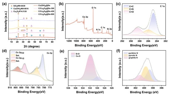 Figure 2a characterizes the crystal structure of Co(OH)2/De and C/Co3O4/De by X-ray diffraction (XRD) analysis. In this pattern, the diffraction peaks at 21.9° and 28.28° clearly indicate the presence of the (101) and (111) crystal planes of SiO2 (JCPDS 99-0039). Using X-ray photoelectron spectroscopy (XPS), we explored the chemical composition of C/Co3O4/De-450 in depth, and the results are shown in Figure 2b–f. Specifically, the data in Figure 2b reveal the presence of Co, O, N, C, and Si within the sample, a finding that is consistent with the previous results obtained through the HAADF-EDS analyses in Figure 1m–p and Figure S3, which verifies the accuracy of the elemental composition. The content of each element can be obtained semi-quantitatively through the peak intensity (Table S1). The C 1s in the material is derived from organic matter in diatomite, and the three peaks at 288.4, 286.1, and 284.8 eV in the high-resolution C 1s spectrum (Figure 2c) are associated with C=O [43], C-N [44], and C-C/C=C [45], respectively. In Figure 2d, two characteristic peaks with binding energies at 803.2 eV and 797.2 eV, respectively, can be observed, which are attributed to the Co 2p1/2 orbital and its accompanying satellite peaks. Meanwhile, the other two peaks with binding energies at 781.3 eV and 786.3 eV correspond to the Co 2p3/2 orbital and its satellite peaks, separately. The results show that C/Co3O4/De exist in high spin Co2+ [46,47,48]. Figure 2e depicts the O-1s high-resolution spectrum, which exhibits two peak at 531.9 eV and 529.0 eV, indicative of the Si-O bond and Co-O band [49]. The presence of oxygen defects enhances the electrical conductivity, promotes efficient redox reactions, and ultimately contributes to the microwave absorption performance [50,51]. In the N 1s spectrum (Figure 2f), doped N shows three morphologies, pyridine-N (398.7 eV), pyridine-N (399.6 eV), and graphite-N (401.0 eV). In Figure S2, the peak at 102.7 eV binding energy is attributed to Si 2p in the diatomite. The above results show that Co(OH)2/De and C/Co3O4/De with the desired structure and morphology can be successfully prepared by a combination of the hydrothermal method and high-temperature pyrolysis.