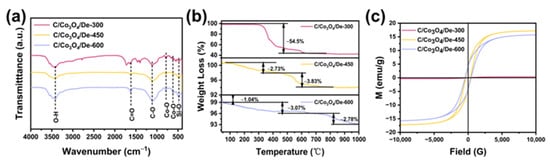 (a) FTIR spectra, (b) TGA, and (c) magnetic hysteresis loops for C/Co3O4/De-300, C/Co3O4/De-450, and C/Co3O4/De-600.