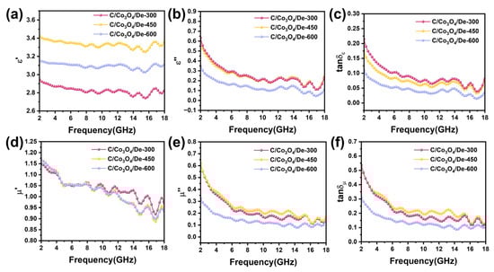 The complex permittivity () and complex permeability (), which describe the response properties of materials in the microwave frequency band, have a profound effect on the microwave absorption properties of wave absorbers. They can be employed to elucidate the attenuation mechanisms by which wave-absorbing materials convert incident EMW energy into heat or other forms of energy. Figure 4a,b presents the complex permittivity of C/Co3O4/De-300, 450, 600 composites across the 2–18 GHz frequency range. The real and imaginary parts of the complex dielectric constant ( and ) represent the role of the material in the storage and loss of electromagnetic energy under the action of an electric field, respectively. Notably, C/Co3O4/De-450 exhibits the highest , ranging from 3.0 to 3.5, balancing the dielectric loss and impedance matching. The values for all the samples show multiple fluctuations in the 12–18 GHz range, suggesting significant polarization loss during EMW attenuation. This is likely due to interfacial polarization from the surface charge accumulation on the Co3O4 and diatomite heterojunction, and dipole polarization from N-O and C-O functional groups introduced during calcination. For , C/Co3O4/De-450 and C/Co3O4/De-300 follow similar trends and have higher values than C/Co3O4/De-600, possibly due to the fragmentation of Co3O4 and diatomite during high-temperature calcination, impacting EMW transmission. The thermogravimetric curves and wave-absorbing properties further confirm this. The values for all the samples exhibit a disordered trend with multiple spurious peaks, stabilizing only in the 2–5 GHz range. This behavior may be due to the synergistic effect of the space charge and orientation polarization caused by the unique evenly distributed porosity on the surface of diatomite coupled with the interfacial polarization generated by the middle cavity structure and surface-loaded transition metal oxides.