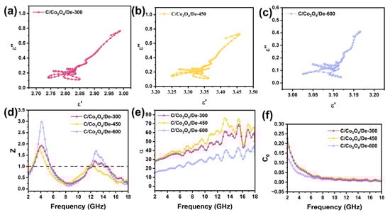 (a) Cole–Cole plots of C/Co3O4/De-300, (b) C/Co3O4/De-450, (c) C/Co3O4/De-600; plots of (d) impedance matching, (e) attenuation constants, and (f) eddy current loss of all the samples.