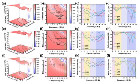 A 3D loss diagram, contour plot of RL with thickness and frequency (S, C, X and Ku bands), and frequency–loss 1D diagram of (a–d) C/Co3O4/De-300, (e–h) C/Co3O4/De-450, and (i–l) C/Co3O4/De-600.