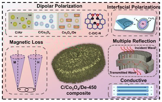 Figure 7 proposes related microwave absorption mechanisms. Firstly, the microporous and cavity structures of diatomite facilitate the reflection, refraction, and scattering of EMWs. The periodic three-dimensional structure of diatomite provides ample propagation paths for incident microwaves, enhancing multiple reflections and scattering within the absorber, thereby boosting microwave absorption. Secondly, the C film formed during calcination and Co3O4 nanomaterials synergistically enhance impedance matching in C/Co3O4/De-450. Thirdly, the presence of disordered carbon, defects, and N-doped carbon on the surface of C/Co3O4/De-450 reduces crystallinity, as observed in the FTIR and XPS spectra. These defects and N-doped sites act as polarization centers, further enhancing dielectric loss. Finally, the differing media interfaces between materials facilitate the aggregation and transfer of additional free electrons to interfaces, promoting interfacial polarization and enhancing the conversion of EMWs into thermal energy dissipation. This contributes significantly to the excellent dielectric properties of C/Co3O4/De-450. The multipolar interfaces of the composites studied primarily originate from the boundaries between air and C, C and Co3O4, and Co3O4 and diatomite.