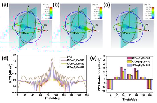 Wave-absorbing materials with small radar cross-section (RCS) values are considered to have good radar stealth capabilities. In order to investigate the EMW absorption performance of the prepared C/Co3O4/De materials under actual far-field conditions, we performed RCS simulations of the three composite nanomaterials using a computer simulation technique (CST). Figure 8a–c shows the three-dimensional intensity images of the reflected signals from the metal substrates (perfect electrical conductor, PEC) after coating C/Co3O4/De-300, C/Co3O4/De-450, and C/Co3O4/De-600, respectively. In contrast, the scattering signal of the C/Co3O4/De-450 sample is notably weak, indicating that it exhibits excellent absorption properties. Figure 8d illustrates the 1D RCS curves of the three model panels, with PEC panels in an angle range of 0–180°, and Figure 8e visualizes the RCS reduction values of the composite coatings for selected angles of incidence. All the samples showed a reduction in the RCS values, with C/Co3O4/De-450 exhibiting the strongest EMW absorption performance at any angle, with an RCS reduction of 19.1 dB m2 at 90°. The outcomes of the CST simulations are in alignment with the EMW absorption properties derived from transmission line theory, which provides a robust theoretical foundation for the practical implementation of EMW absorption in C/Co3O4/De composites.