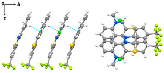 The single crystal of 5-methyl-9-(trifluoromethyl)-12H-quino[3,4-b]-[1,4]benzothiazinium chloride (3) was formed by crystallization from an ethanol/water mixture in a volume ratio of 1/1. The crystal contains water molecules with s.o.f. = 0.25. The –CF3 group is disordered over two positions with s.o.f. equal to 0.6 and 0.4, respectively. The chlorine anion is located close to the N12 nitrogen atom and lies in the plane of the molecule forming one classical N–H···Cl and four weak C–H···Cl hydrogen bonds to three neighboring molecules, as illustrated in Figure 4 and reported in Table 1.
