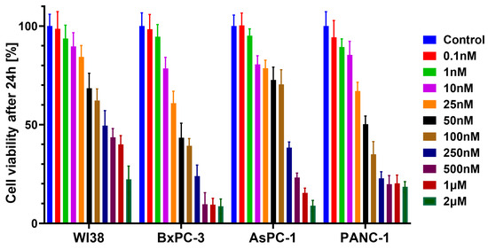 Antiproliferative activity of compound 3 against pancreatic cancer cell lines (Panc-1, AsPC-1 and BxPC-3) and normal fibroblast cell line WI38 in concentration range from 0.1 × 10−3 µM to 2 µM with cell viability after 24 h.