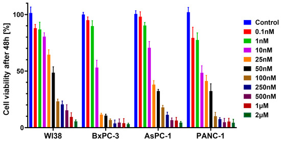 Antiproliferative activity of compound 3 against pancreatic cancer cell lines (Panc-1, AsPC-1 and BxPC-3) and normal fibroblast cell line WI38 in concentration range from 0.1 × 10−3 µM to 2 µM with cell viability after 48 h.