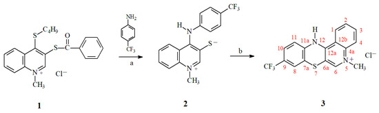 Structural characterization of new compounds (e.g., potential therapeutics) is a valid step of the contemporary search for potent anticancer agents [26,27]. Hence, the synthesis of the trifluoromethyl quinobenzothiazinium derivative (3) is presented with its structural analysis as well as its anticancer properties. The reaction of 1-methyl-4-butylthio-3-(benzoylthio)quinolinium chloride (1) with 4-(trifluoromethyl)- aniline gave 5-methyl-9-(trifluoromethyl)-12H-quino[3,4-b][1,4]benzothiazinium chloride (3) in a yield of 67% (see Scheme 1). The reaction was performed in a pyridine solution using a 2.5-fold molar excess of aniline.